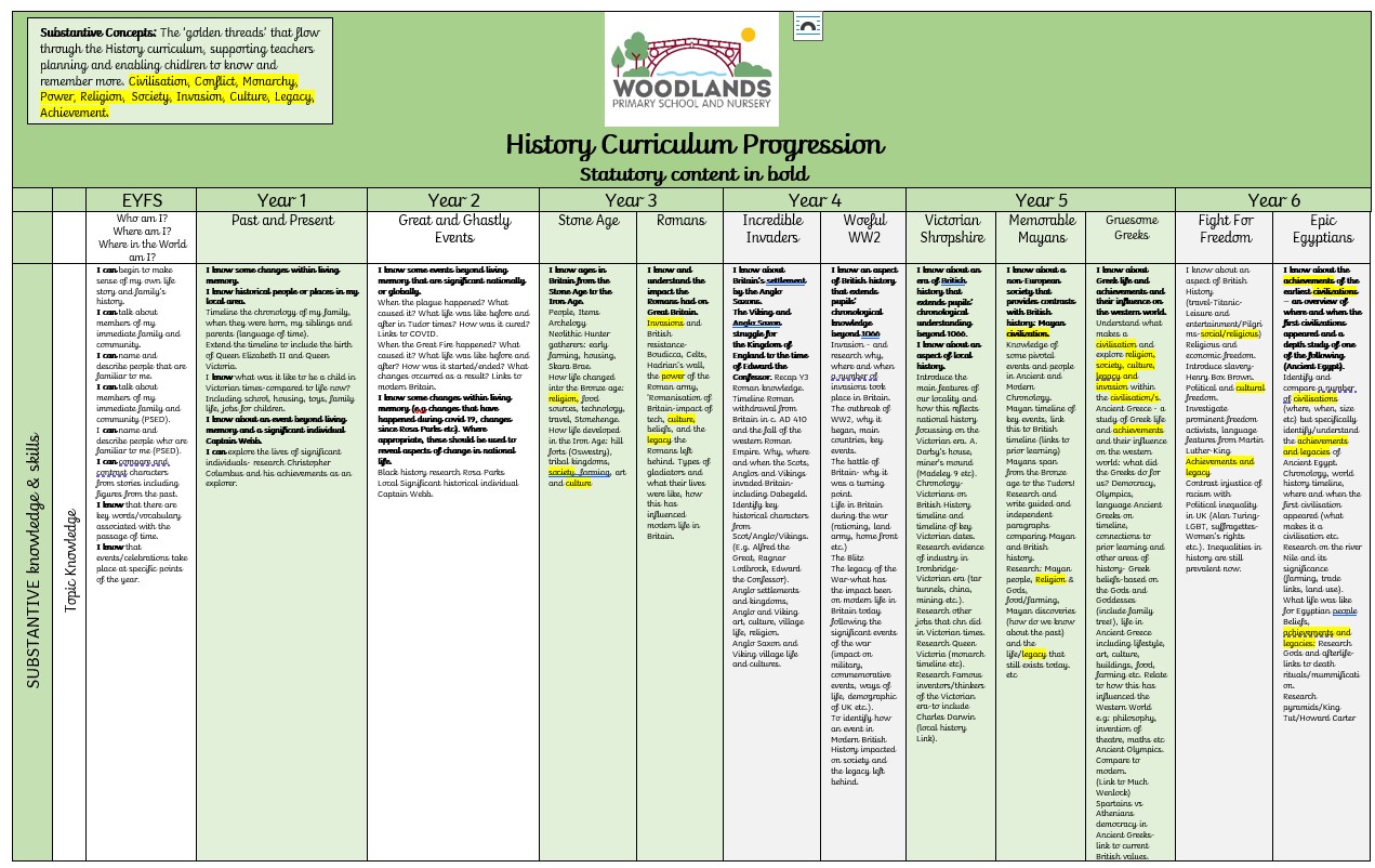 At Woodlands Primary School, we follow the History Curriculum that is specified in the National Curriculum 2014 and the Early Years and the Foundation Stage (EYFS) (September 2021). These frameworks set out the breadth and depth of study and the skills and attributes for learning that children need to acquire and experience. EYFS and Year 1 key skills are completed through Enquiry Based Learning directed by discussions with children to cover all other curriculum objectives fluidly throughout the year.