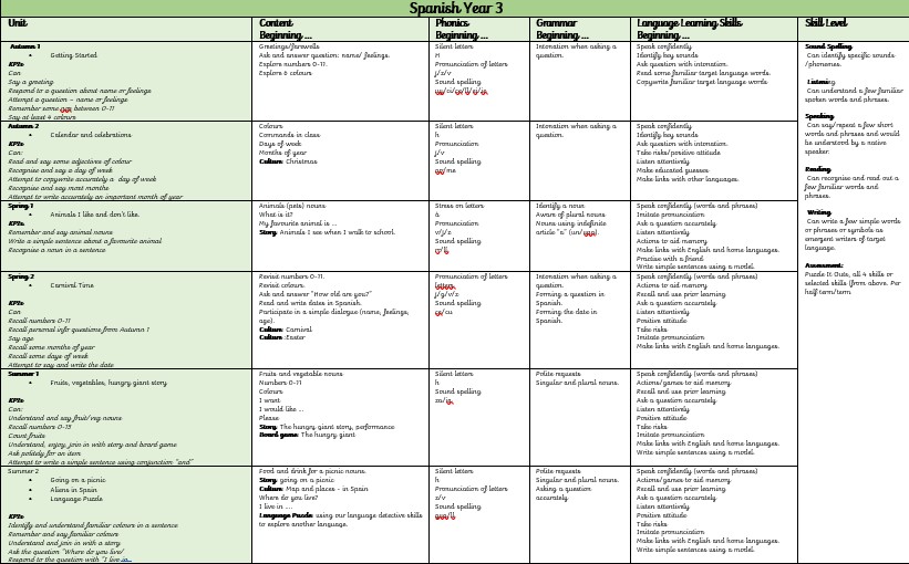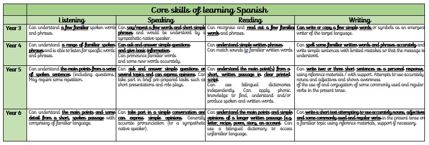 Our Spanish curriculum will ensure all pupils develop key language learning skills, as set out by the national curriculum, as well as a love of languages and learning about other cultures. These are as follows: