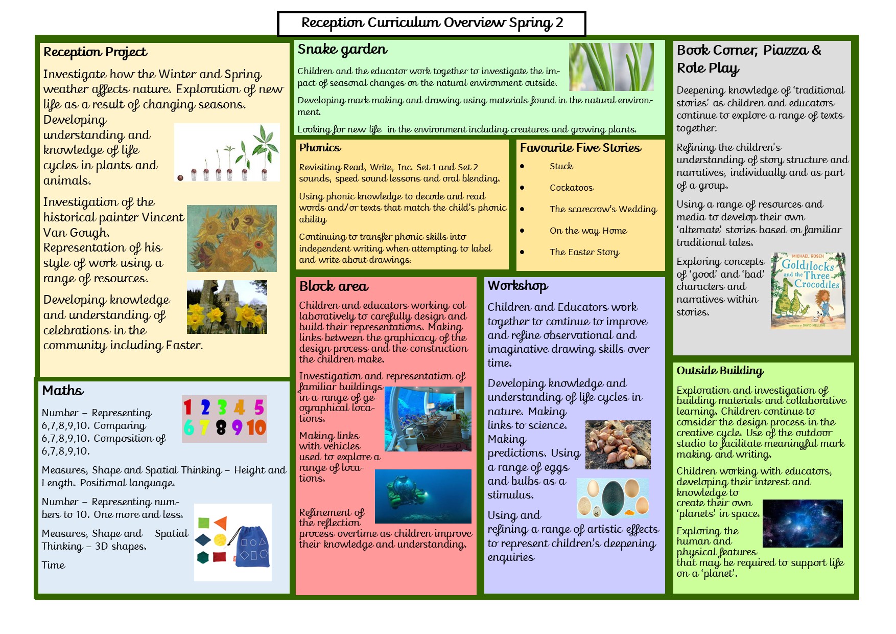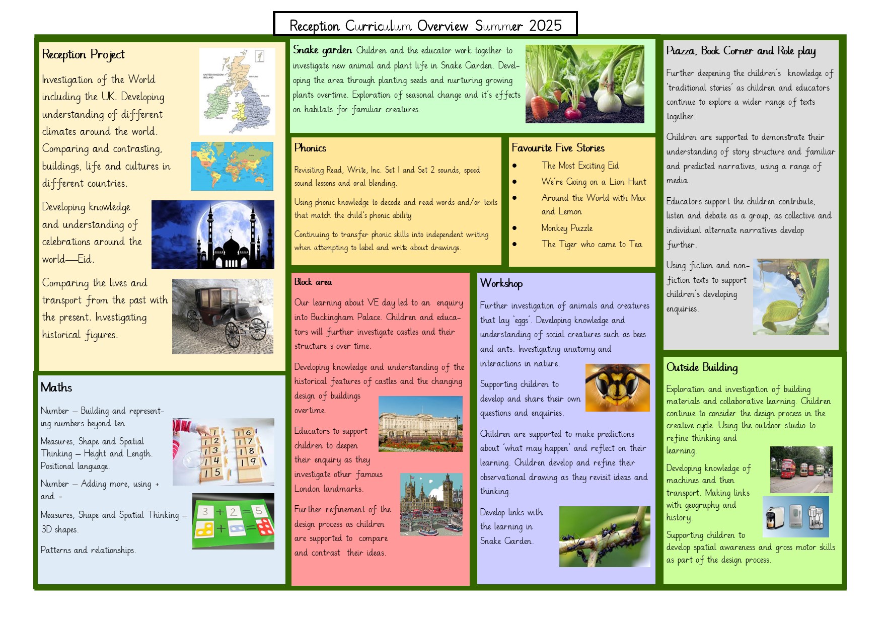 - During snack time children are supported to experience a weekly mathematics focus which is rotated on a half termly basis. This is to ensure children experience full coverage as part of a spiral curriculum. Educators offer a range of learning activities to cover each curriculum area. They cover;