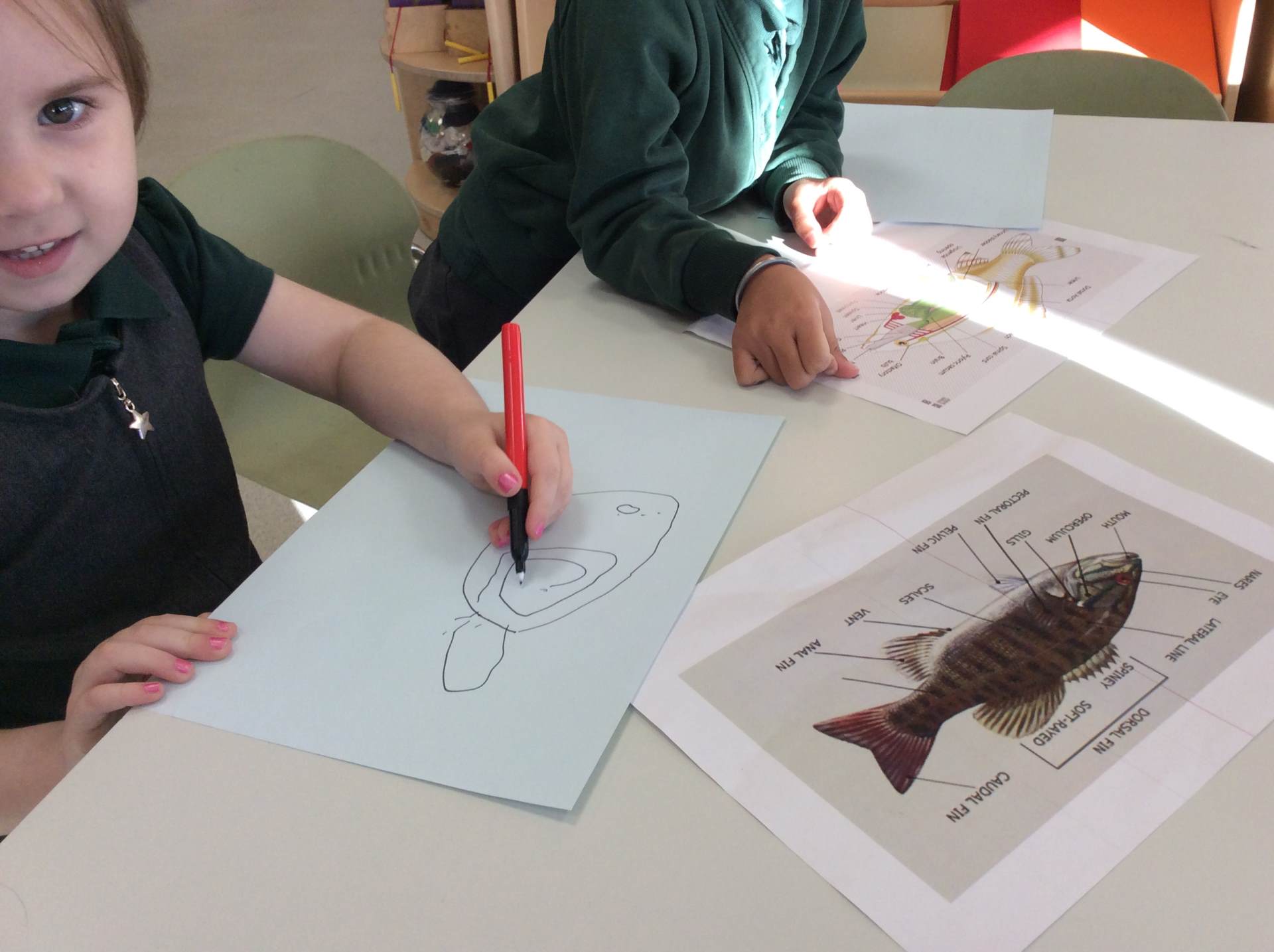 In the workshop, the children are continuing their enquiry into the anatomy of fish. They are looking closely at the fins and how each one helps the fish to move, balance, and steer in the water. They are also exploring how the heart pumps blood to keep the fish active. This ongoing investigation is helping them connect science with real-life examples and deepening their understanding of living things.