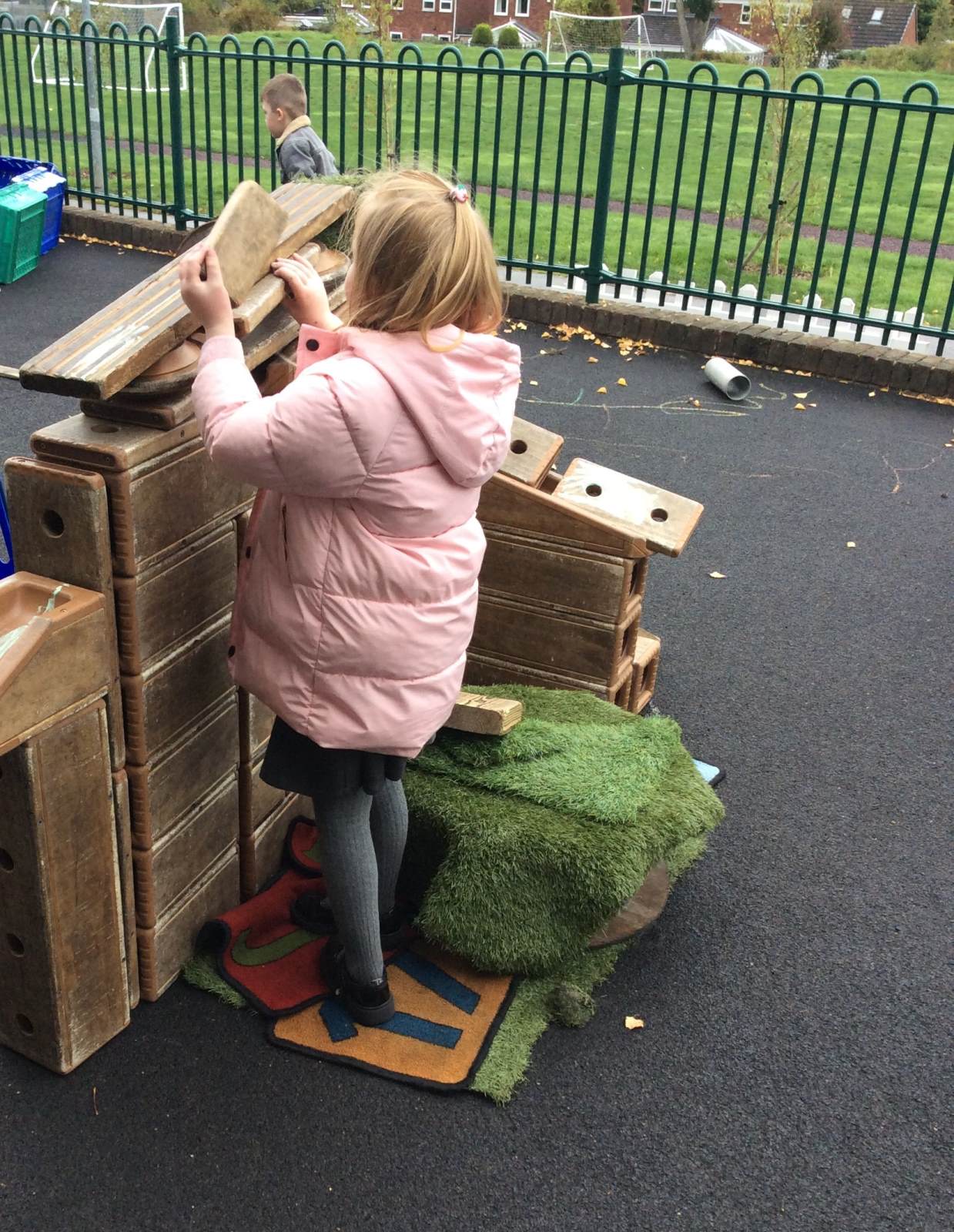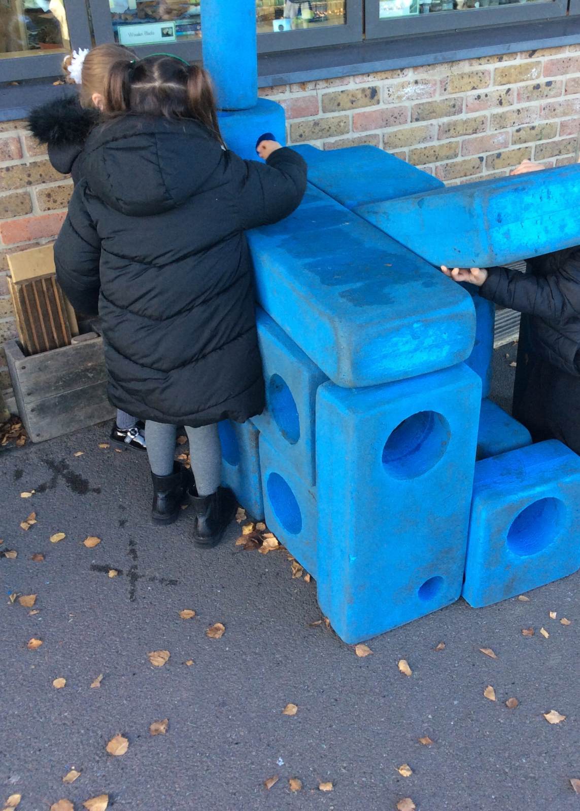 Children are being supported in the outside area to share their ideas and listen to others as they develop their collaborative learning skills.