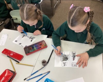 In art, the children explored colour mixing through hands-on activities with paints, crayons, and coloured water. They learned how the three primary colours (red, yellow, and blue) can be combined to make secondary colours. Inspired by the work of artist Clarice Cliff, the children also designed their own decorative plates using bold colours and patterns.