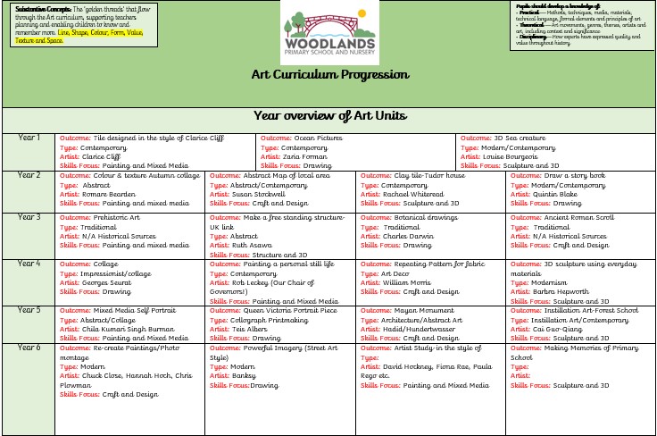 The teaching and implementation of the Art and Design Curriculum at Woodlands Primary and Nursery School is designed with five strands that run throughout each year group. These are:
