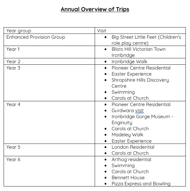 These opportunities include visits to local places of interest such as Madeley, Blists Hill, Enginuity, Wroxeter Roman City and a study of the River Severn including the Ironbridge.