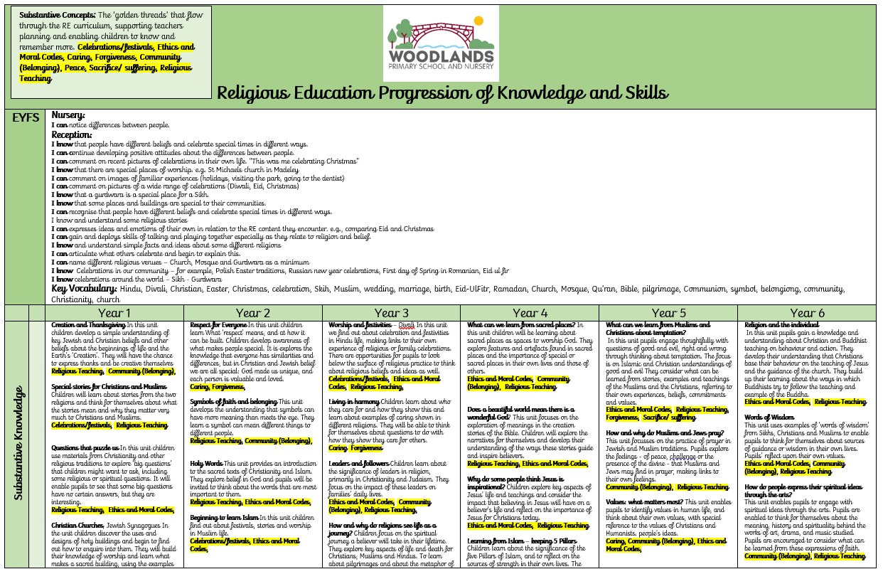 Religious Education is taught during foundation weeks each half term. This allows us to build on prior knowledge and have the time for in-depth discussions needed for children to enhance their understanding within the subject. At Woodlands, RE is linked to our learning across the curriculum through use of our substantive concepts. The substantive concepts for religious studies are: