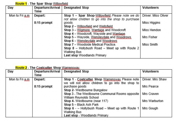We are proud offer two walking buses ‘free of charge’ for children to get to school. The Walking Bus departs from the Spar Shop on the Spinal Path, Woodside at 8:10am, and the Costcutter shop on Warensway, Woodside at 8.10am prompt and runs daily.