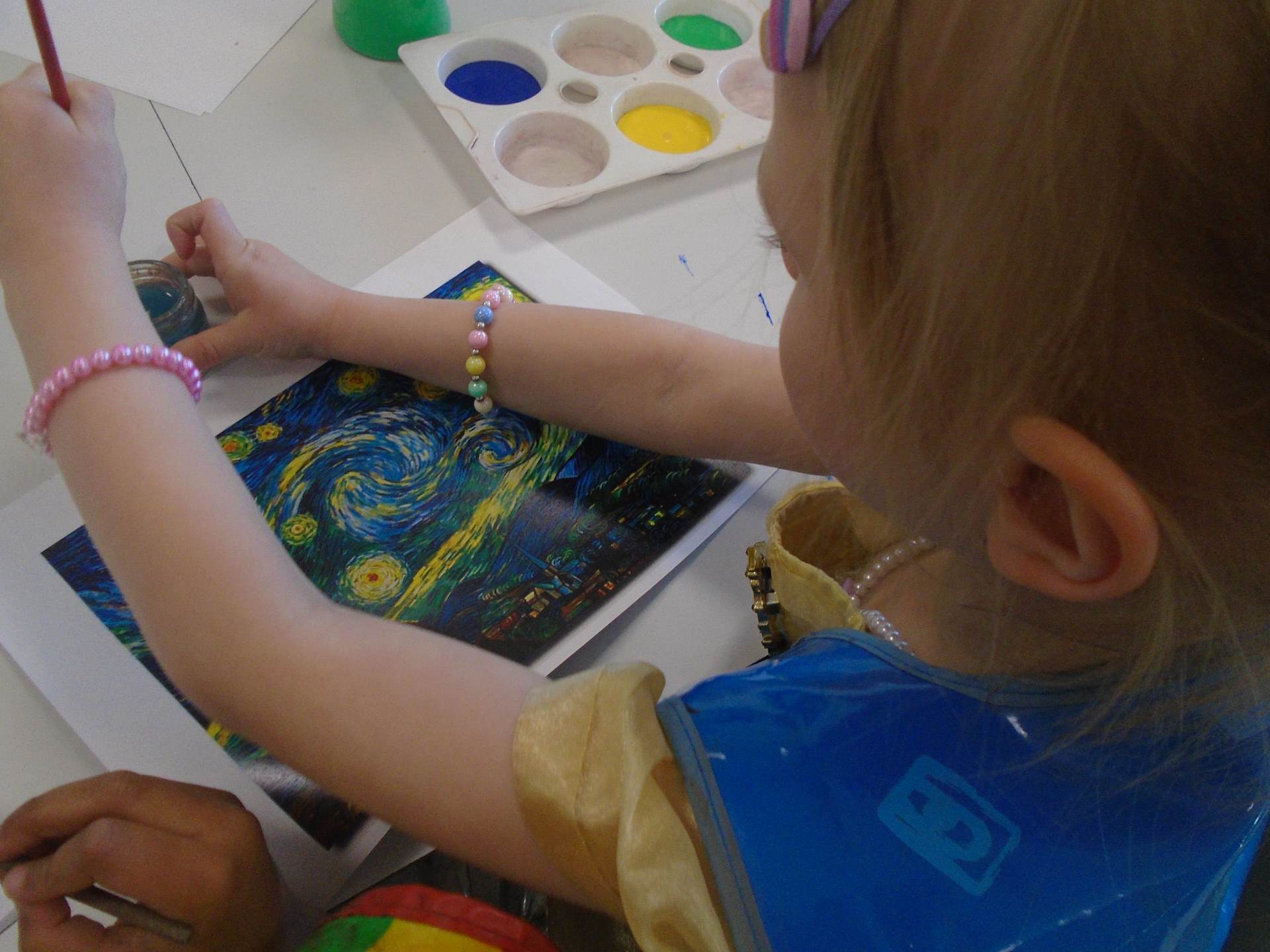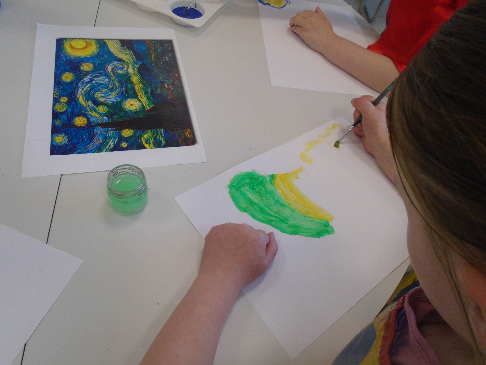 The children learnt about a key historical figure, Vincent Van Gough. The children explored the art talking about his famous pieces and representing similar themes in their own interpretations. The children had the opportunity to use a variety of painting styles and materials to represent their ideas. The educators supported discussions about how the children could use different media to create the shapes and colours on the page.