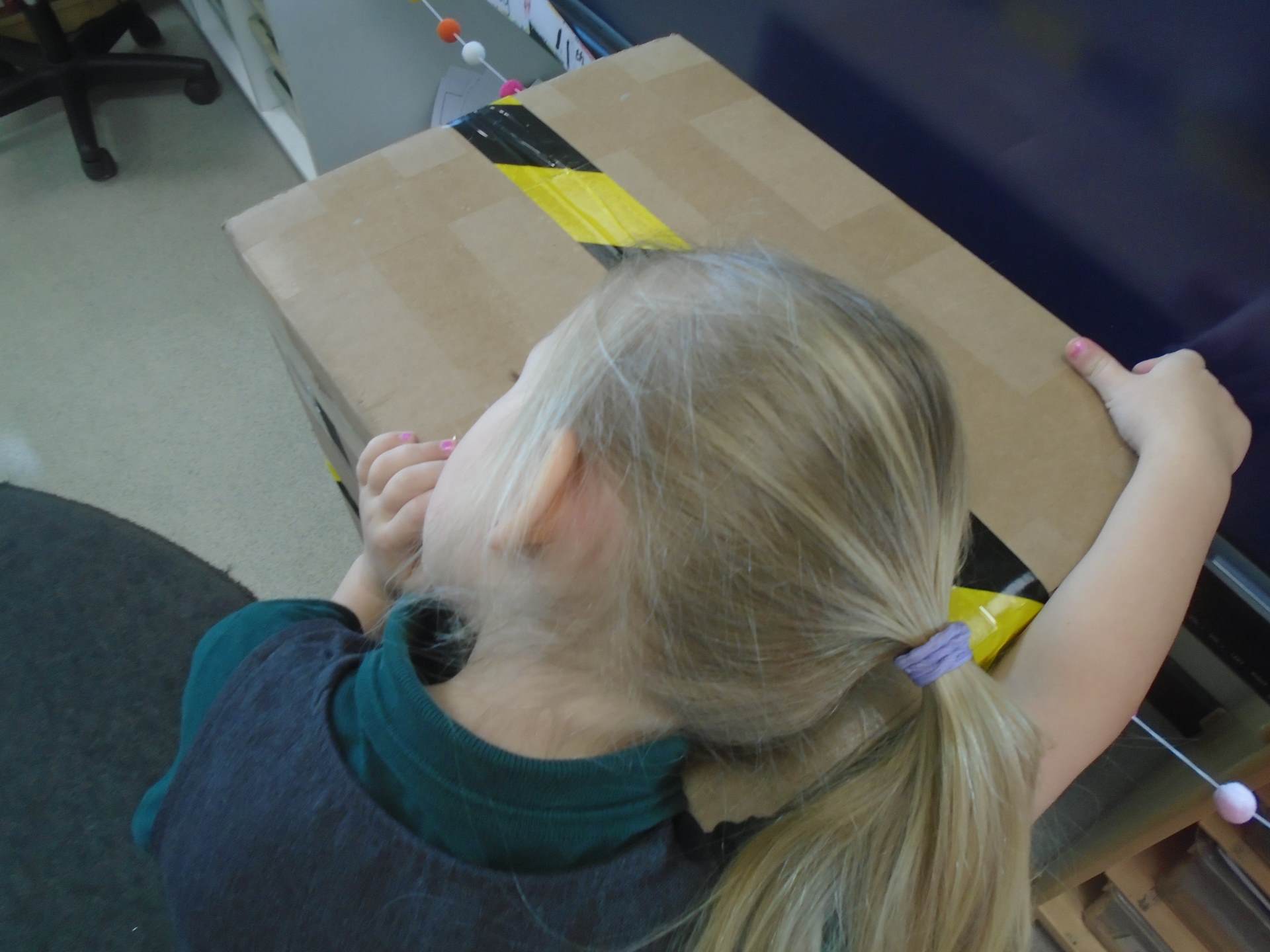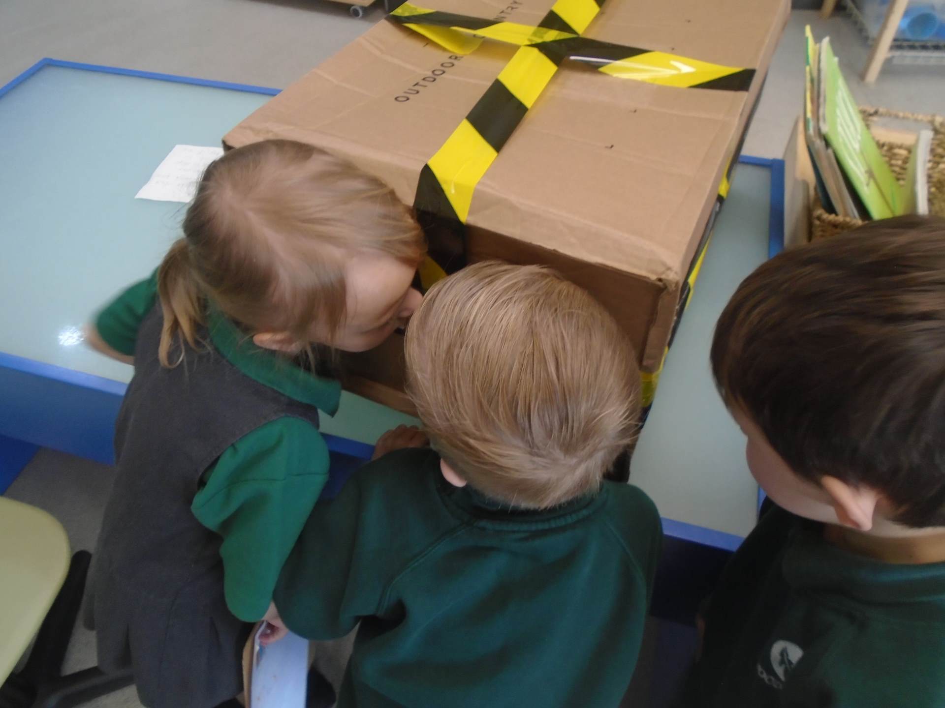 The children began to write creatively discussing 'What is in the box?'. Using their imagination, children used their own ideas to represent what could be in the box and used their phonic knowledge to label and write sentences. The children further represented their ideas using loose parts, construction and different drawing materials. The children shared their ideas about whether that could be anything from tigers scratching, scary snakes, unicorns, children’s families, frogs jumping or teachers inside the box!