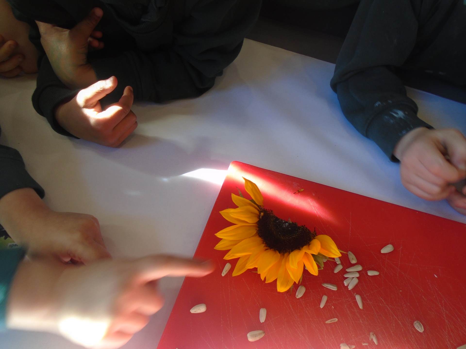 “When the flowers die they drop the seeds and now sunflowers grow.”