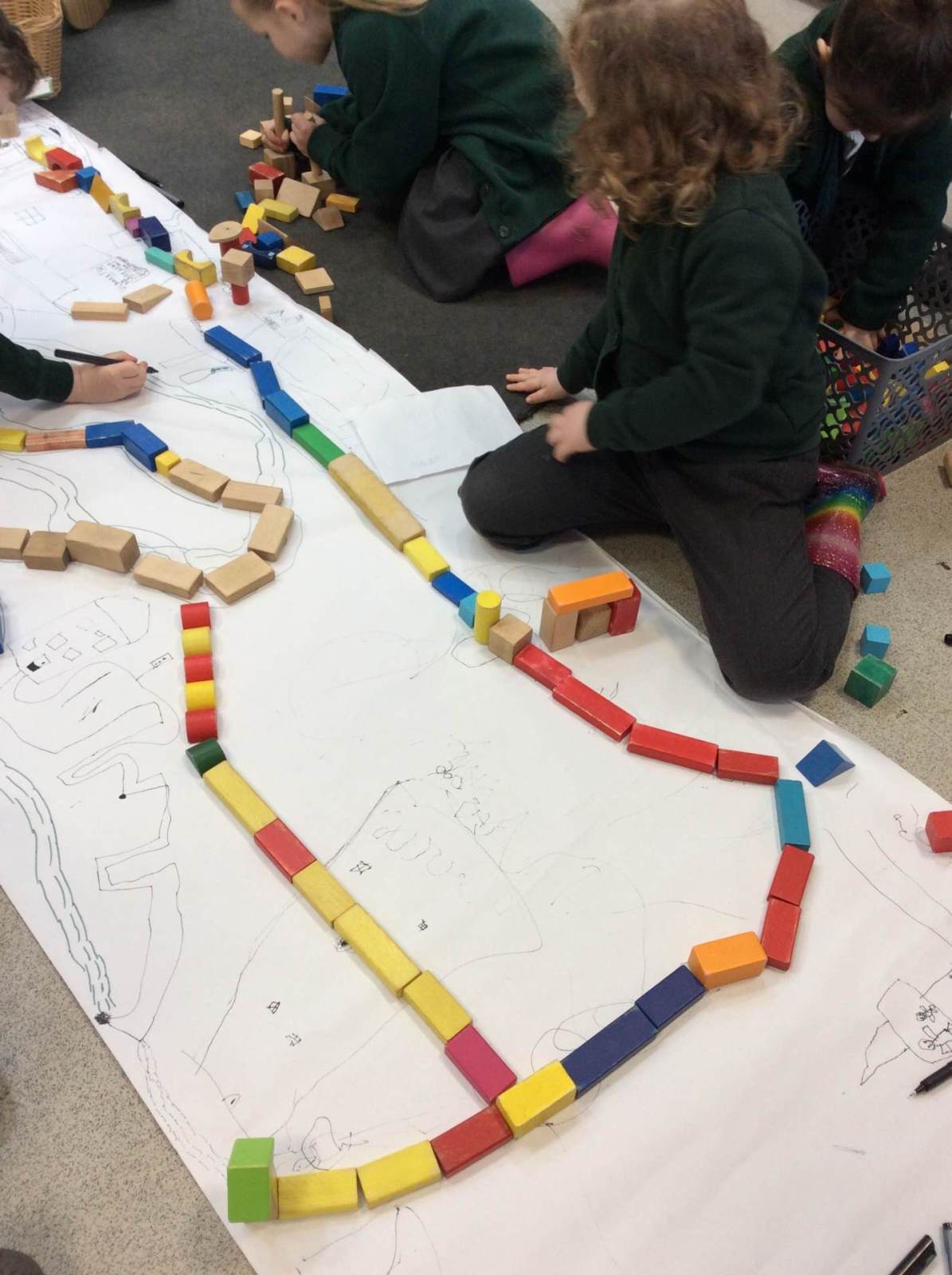 Children then developed this learning further by applying it to map making and reading. The children have begun to learn about the ‘key’ on a map and have started to use simple symbols in their own maps.