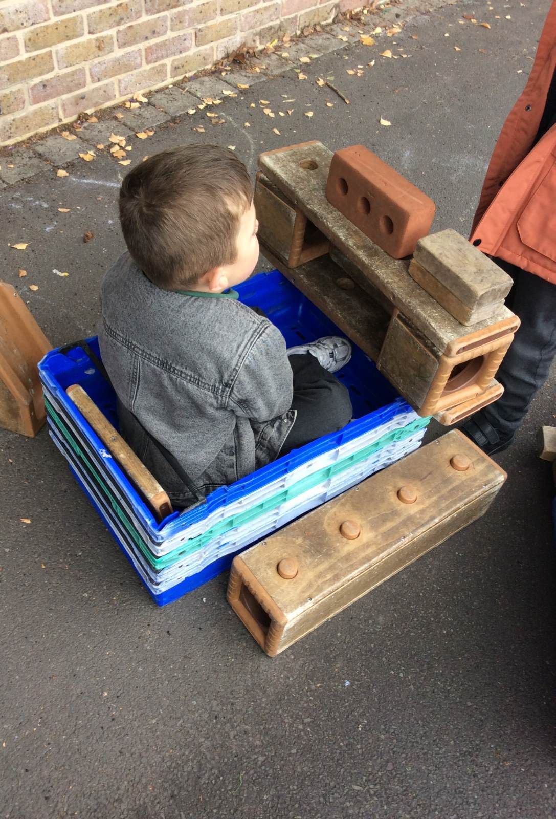 Children have reflected on their own experiences of holidays and begun to develop their shared ideas as they build caravans, trains, aeroplanes, holiday houses etc.