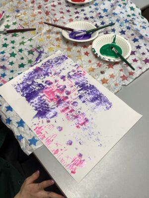 We were very artistic this month too. In Art, the children discussed an image and talked about what they could see, what they thought was happening, what they wondered and what they thought about the image of a family on the moon. This introduced us to retrofuturism and how popular culture can influence art. We had great fun with exploring lots of pieces of art within this genre. Looking at a pictures themed about space, we discussed how they had been created and the choices that the artist had made. Using a viewfinder, the children created a section of their favourite image using different mediums. This then inspired us to create a printing plate- combining different materials based on their texture. We then used this to create our own printed art work – using a colour pallet of our choice. The final pieces were lovely!